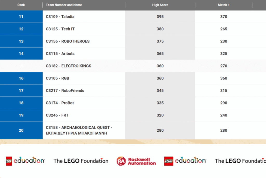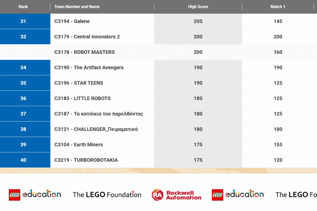 Οι ROBOT MASTERS, που συμμετείχαν για πρώτη φορά στον διαγωνισμό, κατέκτησαν την 33η θέση στο Robot Game με 200 πόντους. Παρότι δεν κατάφεραν να προκριθούν στον Μεγάλο Τελικό, τα παιδιά απέκτησαν πολύτιμη εμπειρία και έκαναν ένα σημαντικό πρώτο βήμα στον κόσμο της εκπαιδευτικής ρομποτικής.